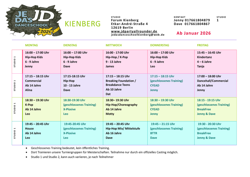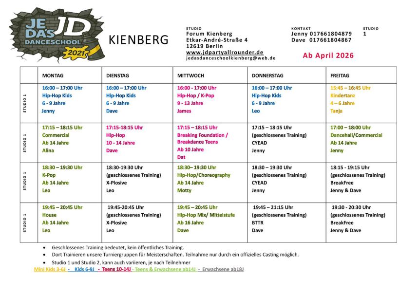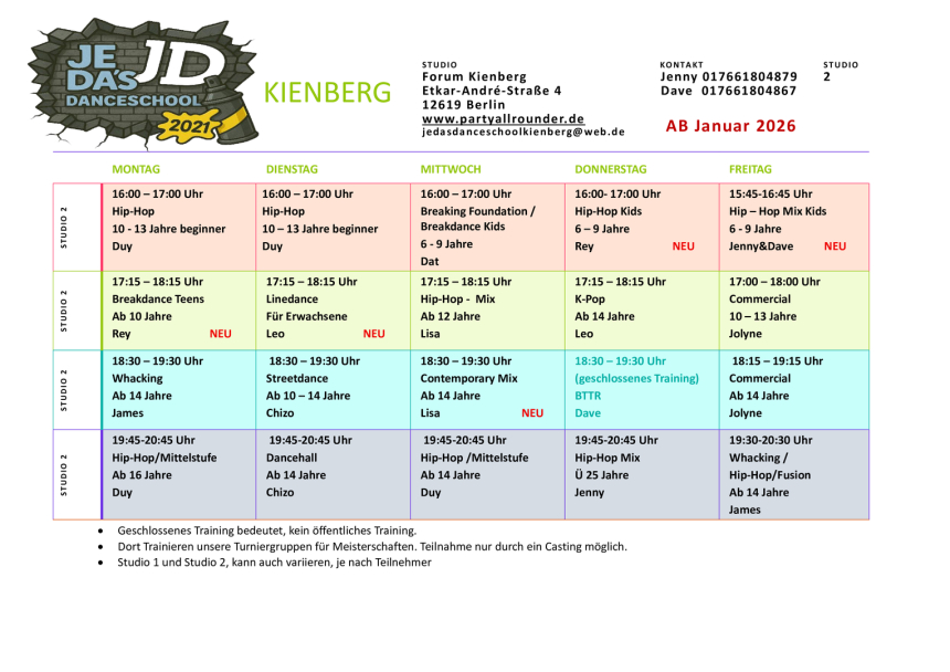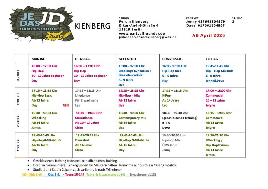 Wir haben Im Forum Kienberg 2 Tanzräume, daher auch 2 Kurspläne :-)